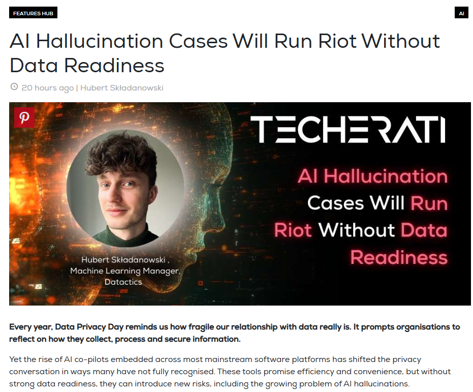 Hubert Składanowski, Machine Learning Manager at Datactics recently penned an article for Techerati on Data Privacy Day. Click the link below the graphic to read the article in full.